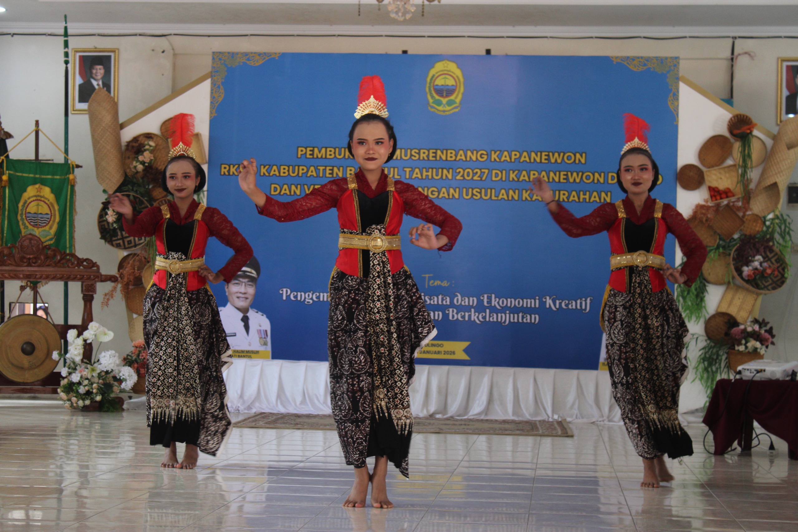 Rangkaian acara pembukaan Musrenbang Kabupaten Bantul di Kapanewon Dlingo juga dimeriahkan dengan penampilan seni Tari Ngambar Arum, sebagai wujud pelestarian budaya lokal sekaligus dukungan terhadap pengembangan pariwisata daerah.
