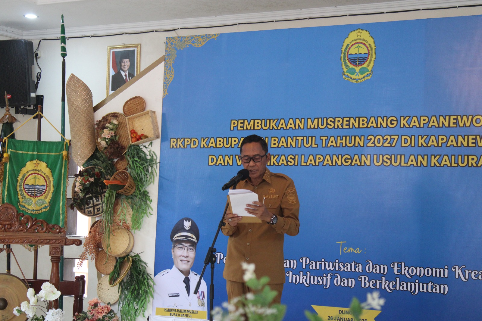 Pemerintah Kabupaten Bantul melaksanakan pembukaan Musyawarah Perencanaan Pembangunan (Musrenbang) Kabupaten Bantul yang bertempat di Pendopo Kapanewon Dlingo, pada Senin, 26 Januari 2026.